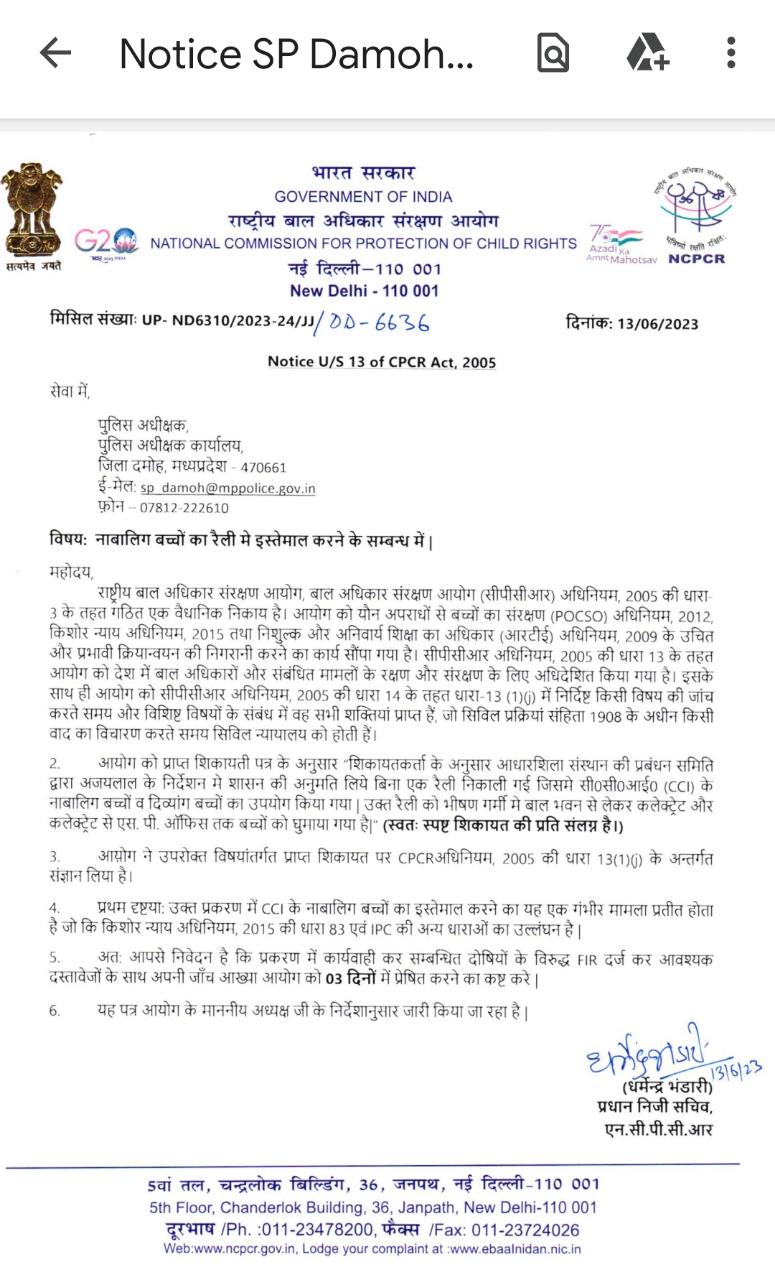 दमोह जिले में पिछले कुछ दिनों से सब कुछ ठीक-ठाक नहीं चल रहा है। लगातार शहर की फिजा बिगड़ती जा रही है। पिछले 6 माह से दमोह जिले में धर्मांतरण के मामले लगातार सामने आ रहे हैं। ईसाई मिशनरी एवं गंगा स्कूल दो ताजा मामले हैं इसके उदाहरण हैं। 2 दिन पूर्व राष्ट्रीय बाल संरक्षण आयोग द्वारा ईसाई मिशनरी द्वारा संचालित छात्रावास वार्डन के संबंध में प्राप्त हुई शिकायत की जांच की गई थी। इसके बाद ईसाई मिशनरी ने नाबालिग एवं दिव्यांग बच्चों को साथ ले जाकर कलेक्टर एवं एसपी को ज्ञापन सौपे थे। इस मामले को राष्ट्रीय बाल अधिकार संरक्षण आयोग ने गंभीरता से लेते हुए पुलिस अधीक्षक को एक नोटिस जारी किया है। आयोग ने अपने नोटिस में कहा है की सीपीसीआर 2005 की धारा तीन के तहत गठित एक वैधानिक निकाय है। आयोग को यौन अपराधों से बच्चों का संरक्षण अधिनियम 2012, किशोर न्याय अधिनियम 2015 तथा नि:शुल्क और अनिवार्य शिक्षा का अधिकार अधिनियम 2009 के उचित और प्रभावी क्रियान्वयन की निगरानी का कार्य सौंपा गया है। जिसमें वह सभी शक्तियां प्राप्त हैं जो सिविल प्रक्रिया संहिता 1960 के अधीन वाद का विचारण करते समय सिविल न्यायालय की होती हैं। नोटिस में आगे कहा गया है आयोग को शिकायत मिली है की आधारशिला संस्थान की प्रबंधन समिति द्वारा डॉ अजय लाल के निर्देशन में शासन की अनुमति लिए बिना एक रैली निकाली गई। जिसमें नाबालिग और दिव्यांग बच्चों का उपयोग किया गया है। उक्त रैली को भीषण गर्मी में बाल भवन से लेकर कलेक्ट्रेट और एसपी ऑफिस तक बच्चों को घुमाया गया। आयोग ने मामले को संज्ञान में लिया है। उक्त प्रकरण में सीसीआई के नाबालिग बच्चों का इस्तेमाल करना एक गंभीर अपराध है। अतः प्रकरण में कार्रवाई कर दोषियों के विरुद्ध एफ आई आर दर्ज कर आवश्यक दस्तावेजों के साथ अपनी जांच आख्या 3 दिन में प्रेषित करें।