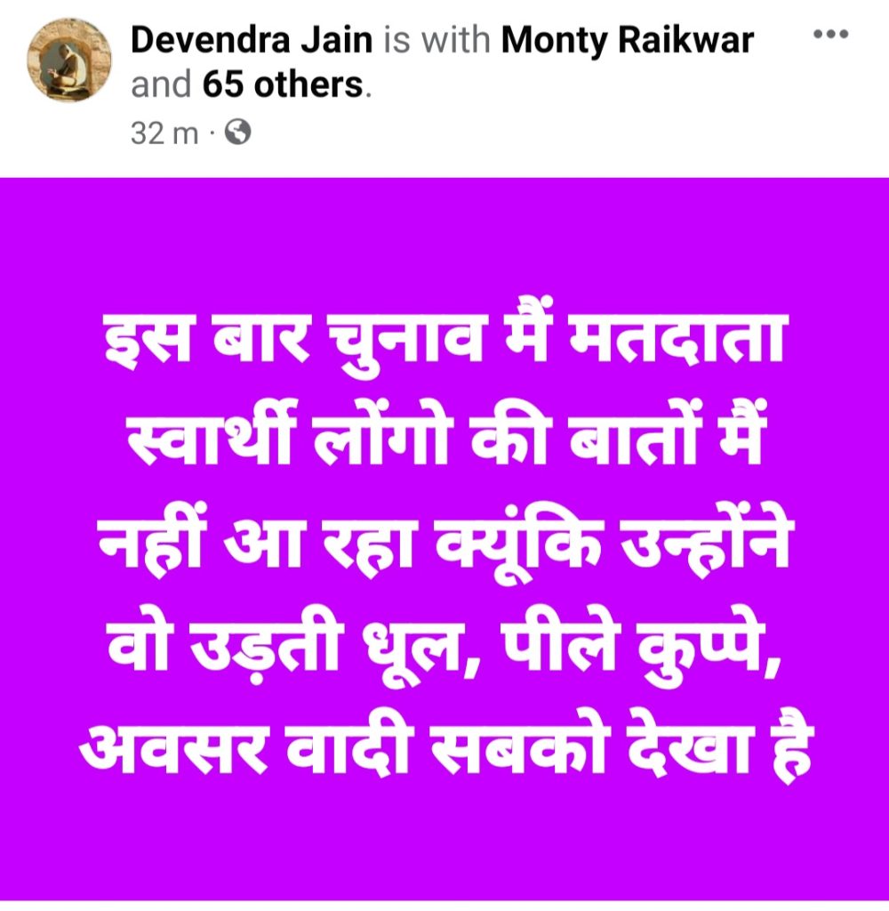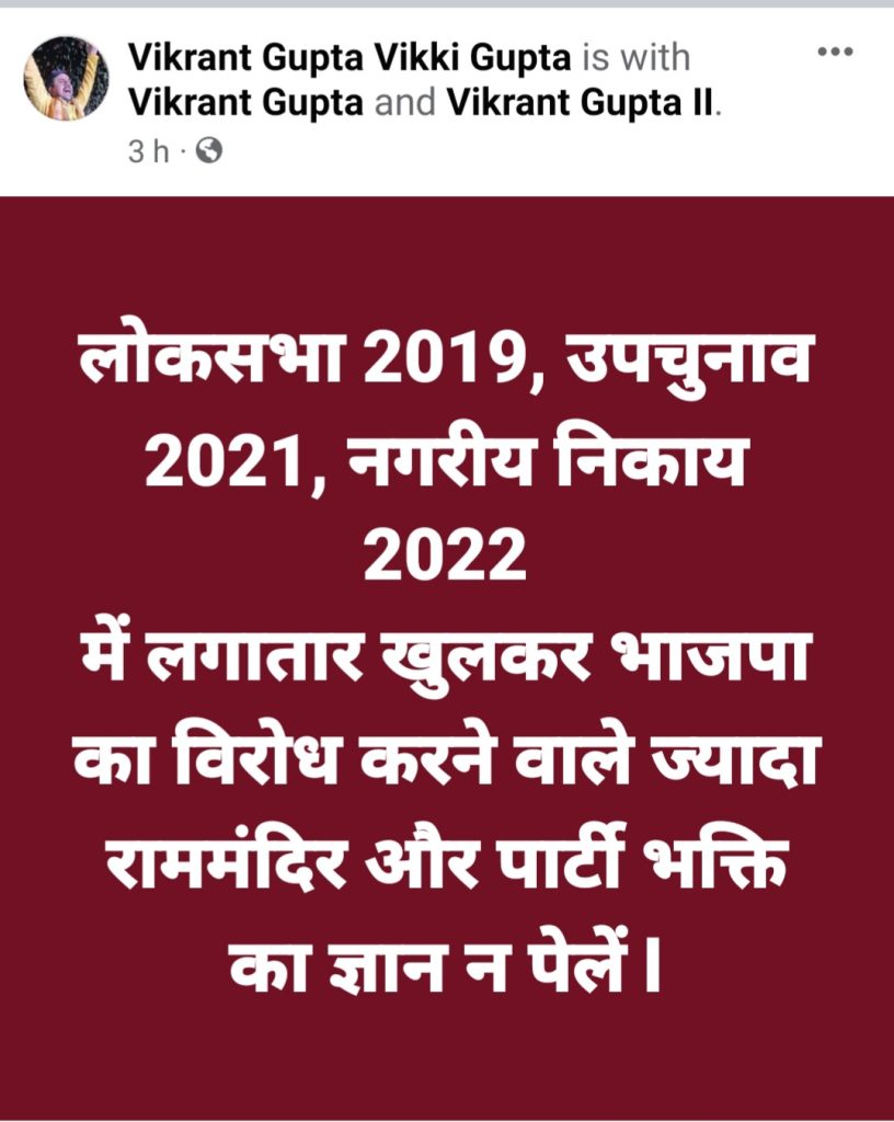 मुंह जवानी जंग के साथ ही सोशल मीडिया पर भी जमकर घमासान मचा हुआ है। भाजपा के कार्यकर्ता पोस्ट डालकर खुद भी भाजपा को घेर रहे हैं। जो कांग्रेस के लिए संजीवनी का काम कर रही है। भाजपा के पार्षद विक्रांत गुप्ता की छवि कट्टर हिंदूवादी नेता की है। वह लिखते हैं कि लोकसभा 2019, उप चुनाव 2021 और नगरीय निकाय चुनाव 2022 में लगातार भाजपा का विरोध करने वाले राम मंदिर और पार्टी भक्ति का ज्ञान न पेलें। विक्रांत ने एक और दूसरी पोस्ट डाली है जिसमें जयंत मलैया को गंगा जमुना मामले के आरोपी मुस्ताक खान के साथ खड़े हुए हैं दिखाया है। उस पोस्ट में लिखा है कि देखिए बीजेपी के नेता हिंदू विरोधी और धर्मांतरण करने वालों के साथ हैं। तो वहीं भाजपा के समर्थक गीतेश अठ्या ने सोशल मीडिया पर एक पोस्ट डाली। जिसमें लिखा कि माहौल बिगाड़ने वालों के लिए यह पता होना चाहिए की राम मंदिर आंदोलन के अगुवा एडवोकेट हरिशंकर जैन और उनके पिता विष्णु शंकर जैन ही थे। गीतेश ने यह संदर्भ वर्तमान में गिरनार जी में चल रहे विवाद को लेकर दिया है। भाजपा के अन्य समर्थक देवेंद्र जैन ने लिखा है कि इस बार मतदाता स्वार्थी लोगों की बातों में नहीं आ रहा है क्योंकि उन्होंने वह उड़ती धूल, पीले कुप्पे और अवसरवादी सबको देखा है। इसी तरह की कई अन्य पोस्ट भी सोशल मीडिया पर पड़ी हुई हैं। भाजपा के लिए परेशानी की बात यह है कि उनका काम तो उन्हीं के पार्टी के लोग बिगाड़ रहे हैं। हालांकि इन सब के बाद भी दोनों पक्षों की प्रत्याशी लगातार जनसंपर्क में लगे हुए हैं। उन्हें अच्छा प्रतिसाद भी मिल रहा है लेकिन यह प्रतिसाद वोटो में कितना बदल पता है देखना होगा।