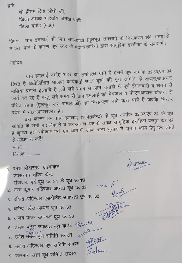 सामूहिक त्यागपत्र में लेख किया गया है कि ग्राम इमलाई में बूथ क्रमांक 32, 33 और 34 स्थित है. इन सभी बूथों के सक्रिय कार्यकर्ता और बूथ प्रभारी, अध्यक्ष, उपाध्यक्ष एवं अन्य पदाधिकारी लंबे समय से भाजपा से जुड़े हुए हैं. प्रत्येक चुनाव में सभी पदाधिकारी और कार्यकर्ताओं ने पूरी ईमानदारी के साथ कार्य किया है. भाजपा को विजय श्री दिलाई है. इसके बाद भी यहां की समस्याओं का निराकरण करने में कोई रुचि नहीं ली गई. पेयजल समस्या के साथ लोगों को पीएम आवास का लाभ भी नहीं मिला, जबकि प्रदेश में भाजपा की सरकार है. इसलिए हम सभी पदाधिकारी सामूहिक रूप से भाजपा से इस्तीफा दे रहे हैं. इस्तीफा देने वालों में ग्राम पंचायत के उप सरपंच और शक्ति केंद्र के संयोजक रमेश श्रीवास्तव, भरत अहिरवार, रविंद्र अहिरवार, धर्मेंद्र पटेल, अजय पटेल, तरुण पटेल, सलमान खान, शिवचरण पटेल, याकूब खान, अलीमुद्दीन खान, किशन पटेल, बृजेंद्र पटेल, लालमन परस्ते, बाबूलाल पटेल, राजा पटेल, विनोद पटेल, रुस्तम खान सहित दर्जनों लोगों ने त्यागपत्र दे दिया है. दरअसल जब 19 तारीख को नरेंद्र मोदी सभा करने आए थे उसे समय इन लोगों ने पानी की समस्या को लेकर अपना विरोध प्रदर्शन करने का मन बना लिया था. लेकिन जब यह भनक भाजपा नेताओं और प्रशासन को लगी तो उन्होंने इन सभी नेताओं और ग्रामीणों को सभा स्थल पर विरोध करने से रोक दिया. जिससे कुपित होकर अब इन सभी ने पार्टी का साथ छोड़ दिया है. मोदी ने अपनी सभा में कहा था कि यदि किसी को किसी योजना का लाभ न मिला हो तो कार्यकर्ता उसे मोदी की गारंटी दे दें लेकिन यहां तो गारंटी उल्टी ही पड़ गई.