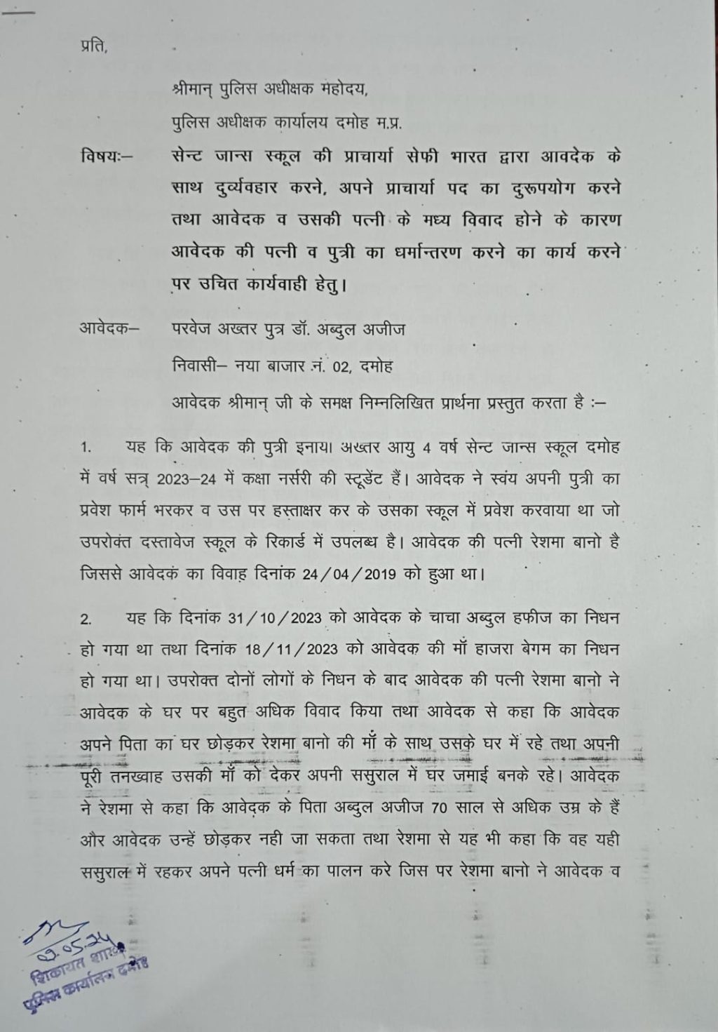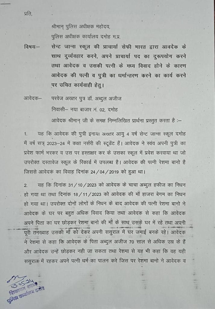 दमोह. एक पिता ने सेंट जॉन्स स्कूल प्राचार्य पर अपनी बेटी और पत्नी का जन्म जबरन धर्मांतरण कराए जाने के आरोप लगाएं हैं. पीड़ित ने मामले की शिकायत पुलिस अधीक्षक से की है.