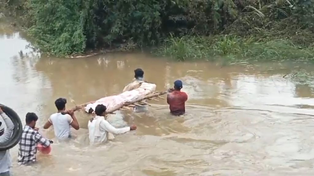 दमोह. बारिश के कारण जिले भर में हालत खराब है. मरने के बाद भी लोगों को सुकून नसीब नहीं हो रहा है. कमर तक पानी के बीच से निकाल कर लोगों को अंतिम संस्कार के लिए ले जाना पड़ता है मामला मगरौन ग्राम पंचायत का है.