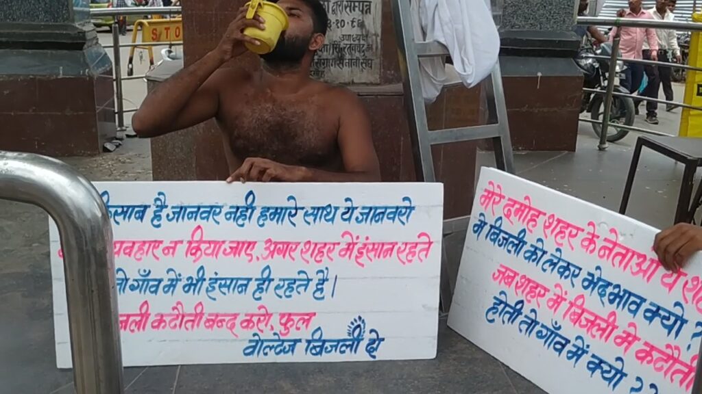 दमोह। अघोषित बिजली कटौती एवं वोल्टेज समस्या से परेशान एक युवक अर्धनग्न अवस्था में घंटाघर चौराहे पर धरने पर बैठ गया है युवक का आरोप है कि ग्रामीण क्षेत्रों में बिजली के मामले में भेदभाव किया जा रहा है।