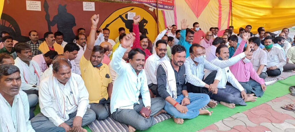 दमोह। मध्यप्रदेश पंचायत एवं ग्रामीण विकास संयुक्त मोर्चा के तत्वाधान में आज दमोह जिले में लगातार छठवें दिन भी अनिश्चितकालीन कलम बंद हड़ताल जारी रही। आज के आंदोलन में मध्य प्रदेश सरकार को सद्बुद्धि प्रदान करने हनुमान चालीसा का पाठ एवं भजन कीर्तन का आयोजन किया गया। आज जनपद पंचायत बटियागढ़ संयुक्त मोर्चा के सभी अधिकारी कर्मचारी की उपस्थिति रही। इसके अलावा जिला स्तर के सभी संयुक्त मोर्चा संगठन के जिला अध्यक्ष श्री पुष्पेंद्र पटेल दिलीप पाठक जिला कार्यकारिणी अध्यक्ष,श्री,आर.के.चौबे अतिरिक्त कार्यक्रम अधिकारी बटियागढ़, श्रीमती अनिता गौतम ,राज किशोर मिश्रा, हरेंद्र राजपूत ,अनुराग राजपूत ,अरुण सिंह ,भारत सिंह,आलोक खरे ,रेखा राज ,बबीता अहिरवाल,संतोष ,अजय श्रीवास्तव ,सुधीर सिंह सूर्यभान सिंह,रामस्वरूप चौबे ,मनोज अहिरवार, समीर खान, हुसैन खान ,सुरेंद्र प्रजापति, जितेंद्र राजपूत,गोपाल अग्रवाल ,राजकुमार यादव ,लोचन सिंह,नितिन जैन,भागवत पटेल, दिनेश असाटी,प्रमोद शर्मा ,भागीरथ पटेल,वीरेंद्र मुकेश ,अभिलाषा शुक्ला परियोजना अधिकारी मनरेगा,संजय अहिरवाल ,सुल्तान ठाकुर ,प्रताप रामजी पटेल ,विनोद कुर्मी ,आलोक तिवारी ,लक्ष्मण सिंह ,सौरभ ठाकरे, वीर सिंह,आशीष ठाकुर की उपस्थिति रही।