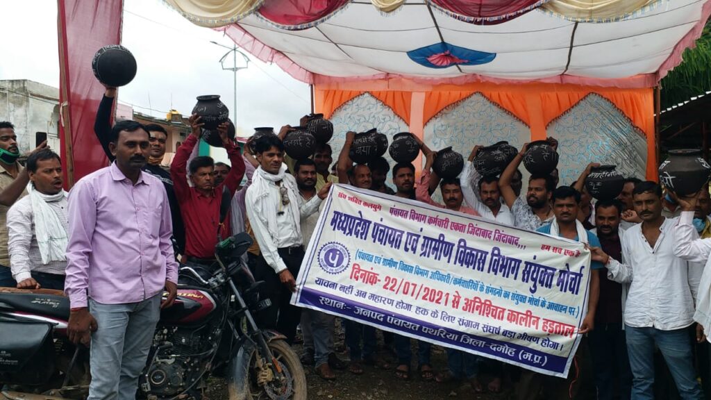 पथरिया से मुकेश दुबे। संयुक्त मोर्चा के बैनर तले हो रहे पंचायत कर्मियों के आंदोलन के बारहवें दिन सभी घटक दलों के अधिकारी एवं कर्मचारियों ने शासन के विरोध में एकत्रित होकर मटका फोड़कर उग्र प्रदर्शन किया।